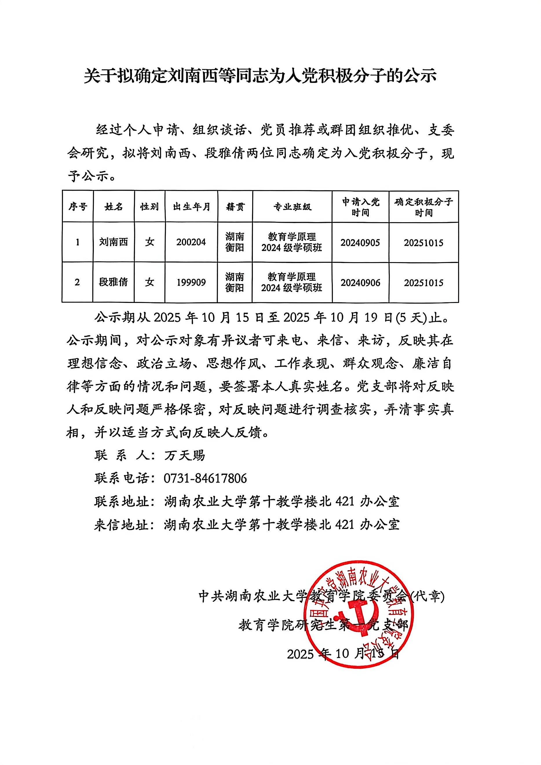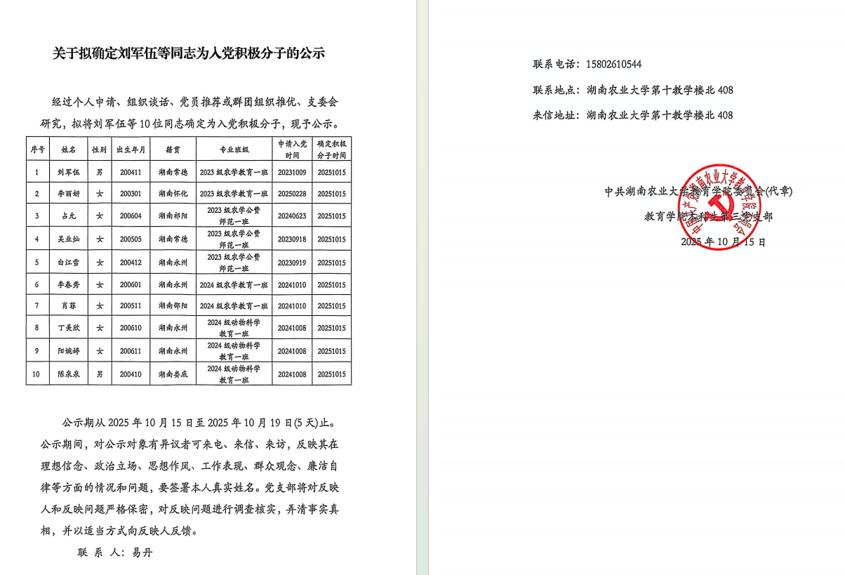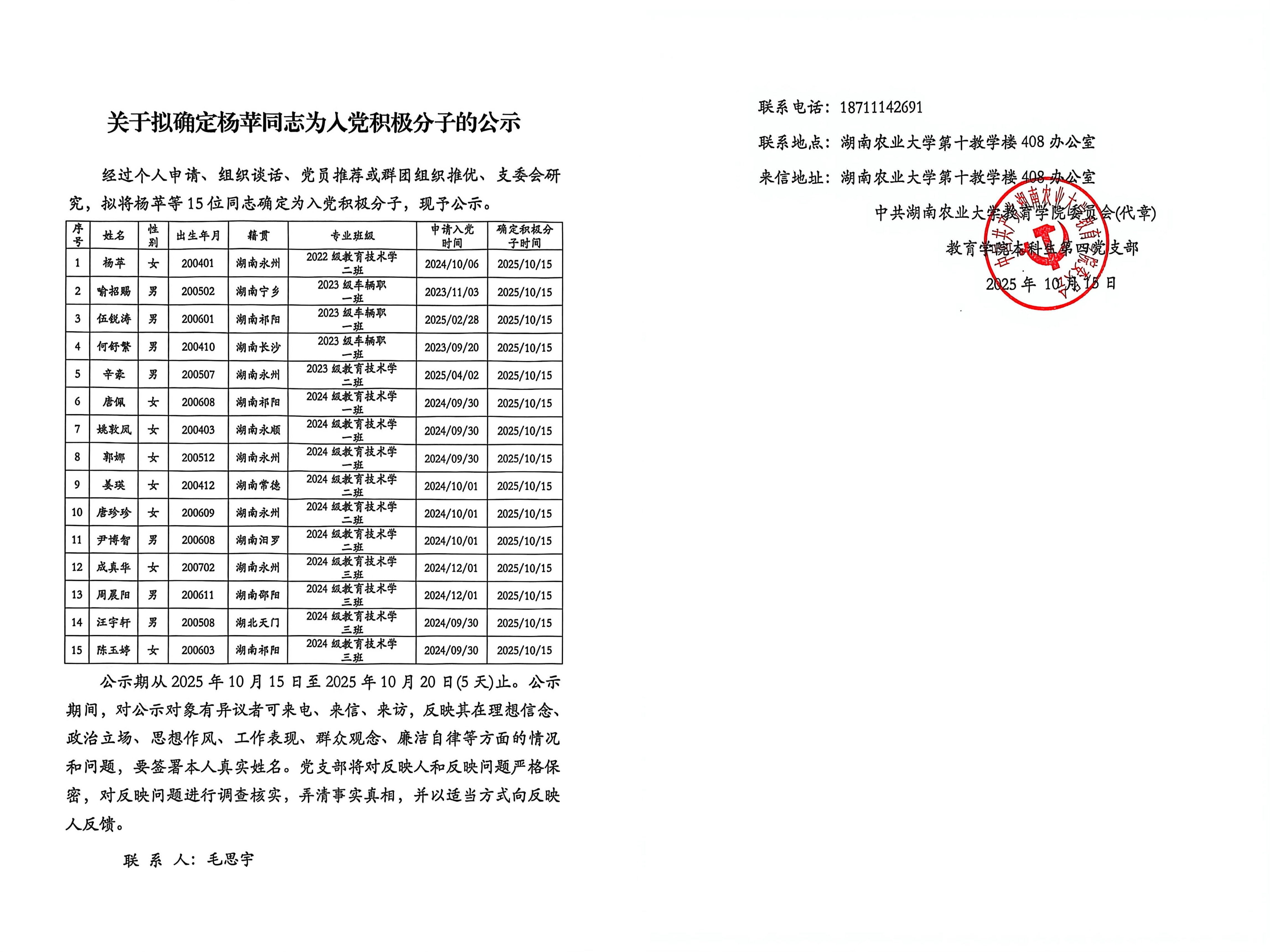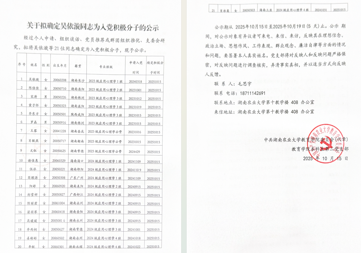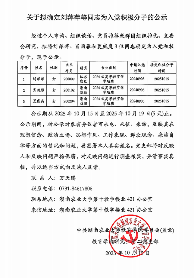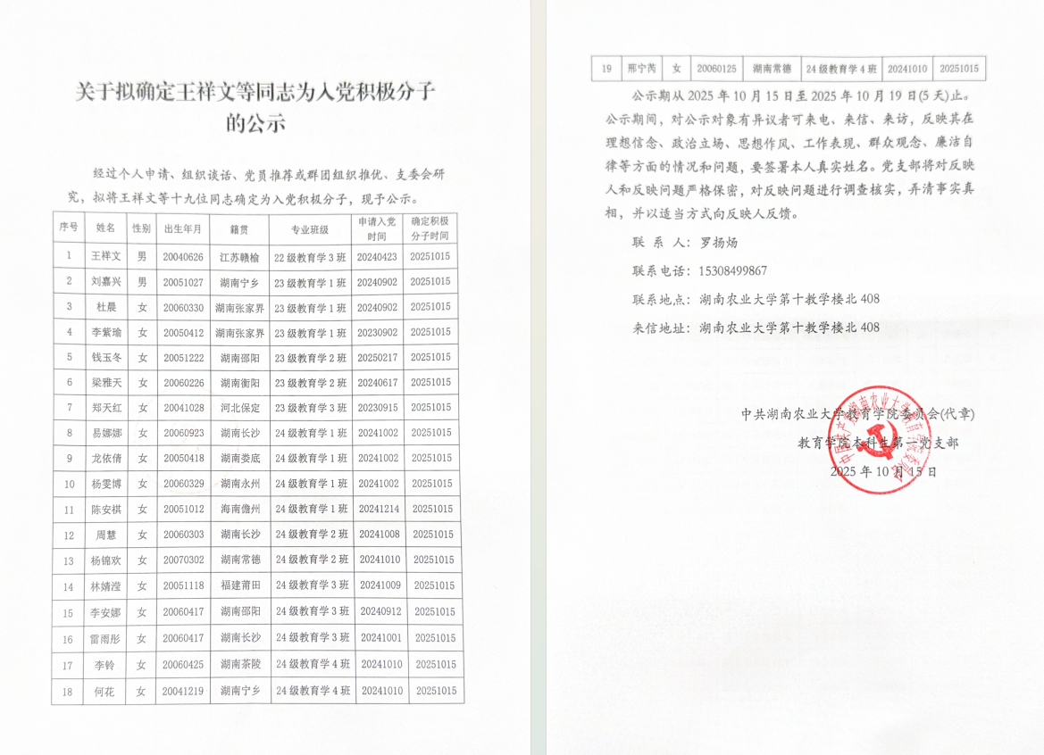 教育学院2025年秋季学期拟确定入党积极分子的公示