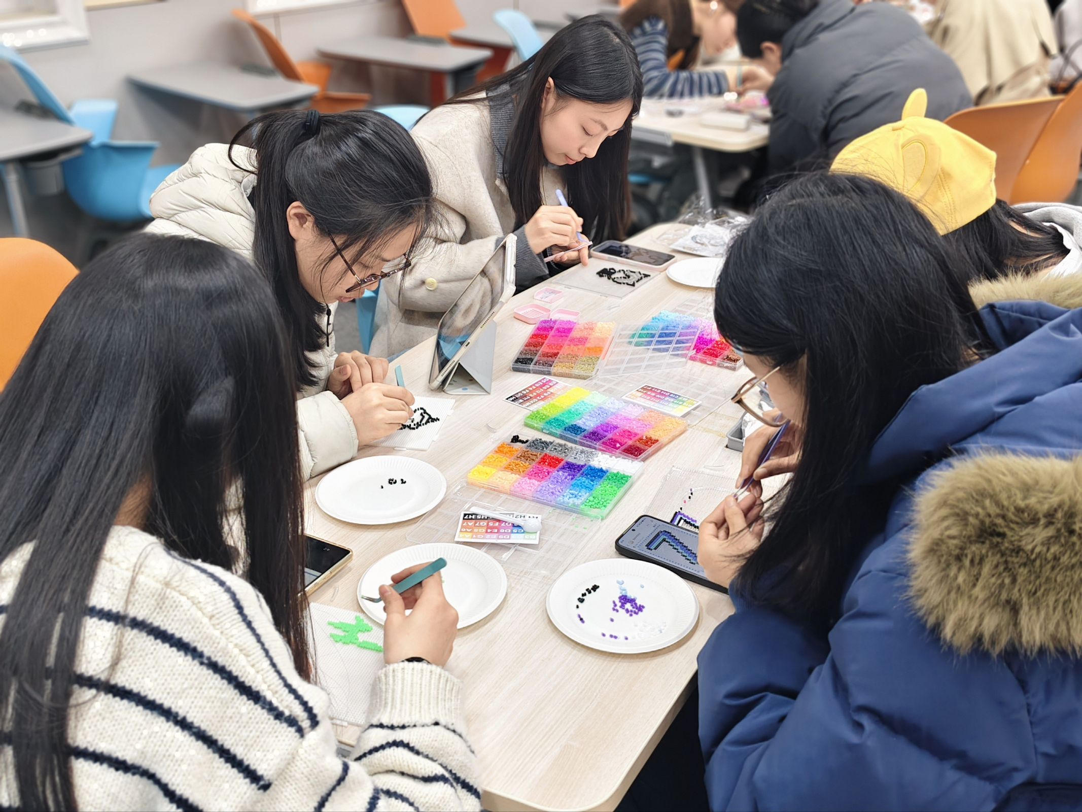 活动伊始,通过“暖场小游戏”迅速拉近了同学们的距离。随后,大家观看“3分钟放松正念冥想”视频,帮助同学们从繁忙的学业节奏中沉淀下来。在核心创作环节,同学们围坐桌前,轻捻五彩拼豆,从构思选色、勾勒轮廓到填充细节,将零散的豆粒逐步拼接成独一无二的手工作品。这种“点滴汇聚成美好”的创作过程,不仅是一种艺术表达,更隐喻着研究生学术成长之路——每一份专注与坚持,终将汇聚成扎实的科研成果与丰盈的人生体验。有同学感言:“拼豆的魅力,在于每一次拼接都是与自我的安静对话。作品完成的瞬间,成就感与内心的平静感同时满溢,心灵得到了温柔的舒缓。”